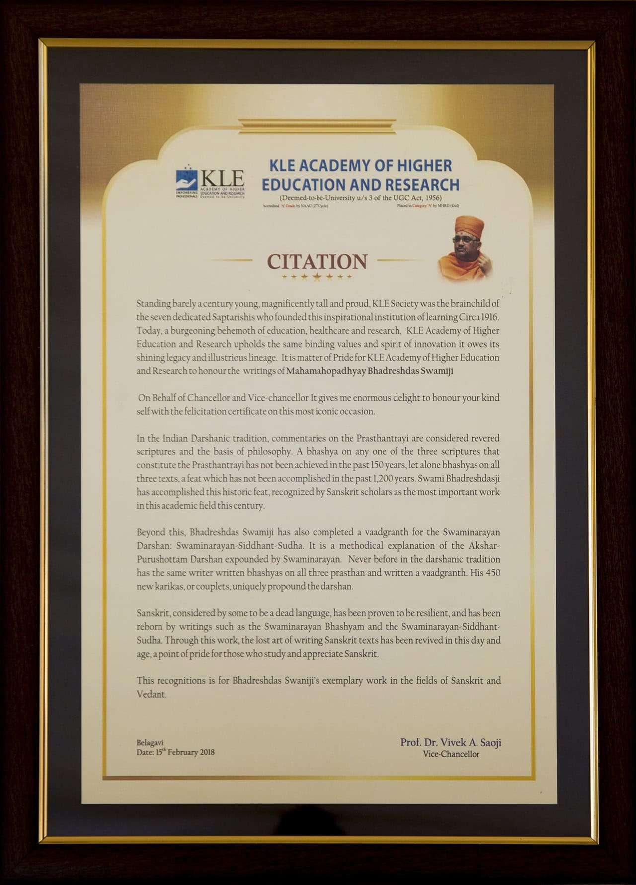 Mahāmahopādhyāya Bhadreshdas Swami was presented this citation award for his exemplary work in Sanskrit and Vedānta.