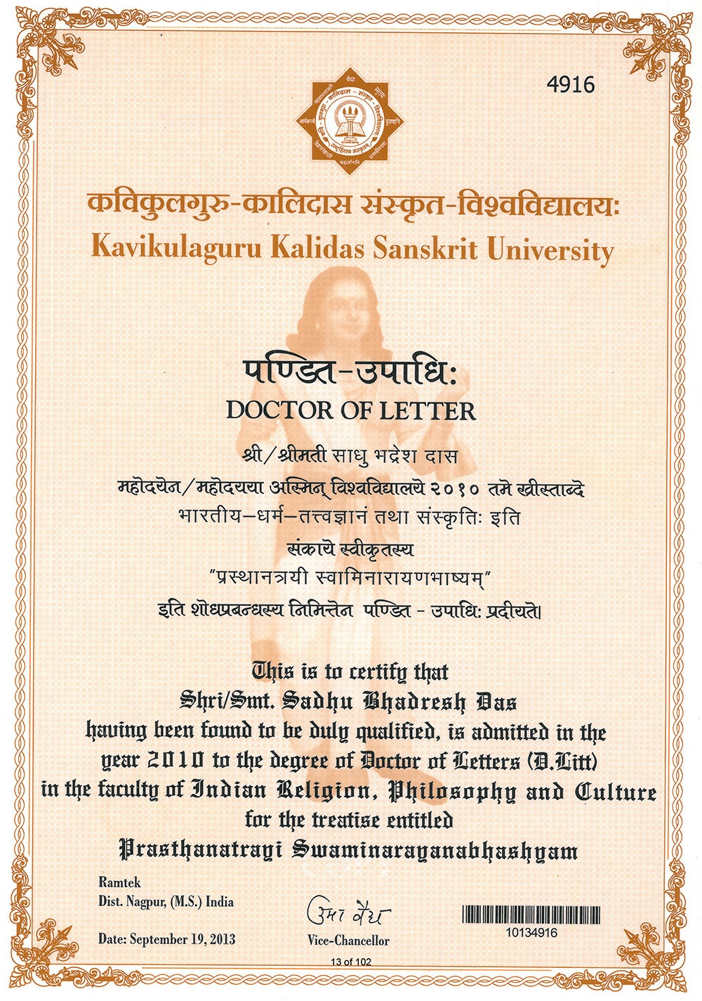 Mahāmahopādhyāya Bhadreshdas SwamiHead of BAPS Swaminarayan Research Institute