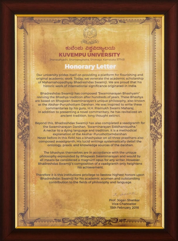 Mahāmahopādhyāya Bhadreshdas Swami was conferred this honorary letter for his academic excellence and his outstanding contributions in philosophy and language stutides.