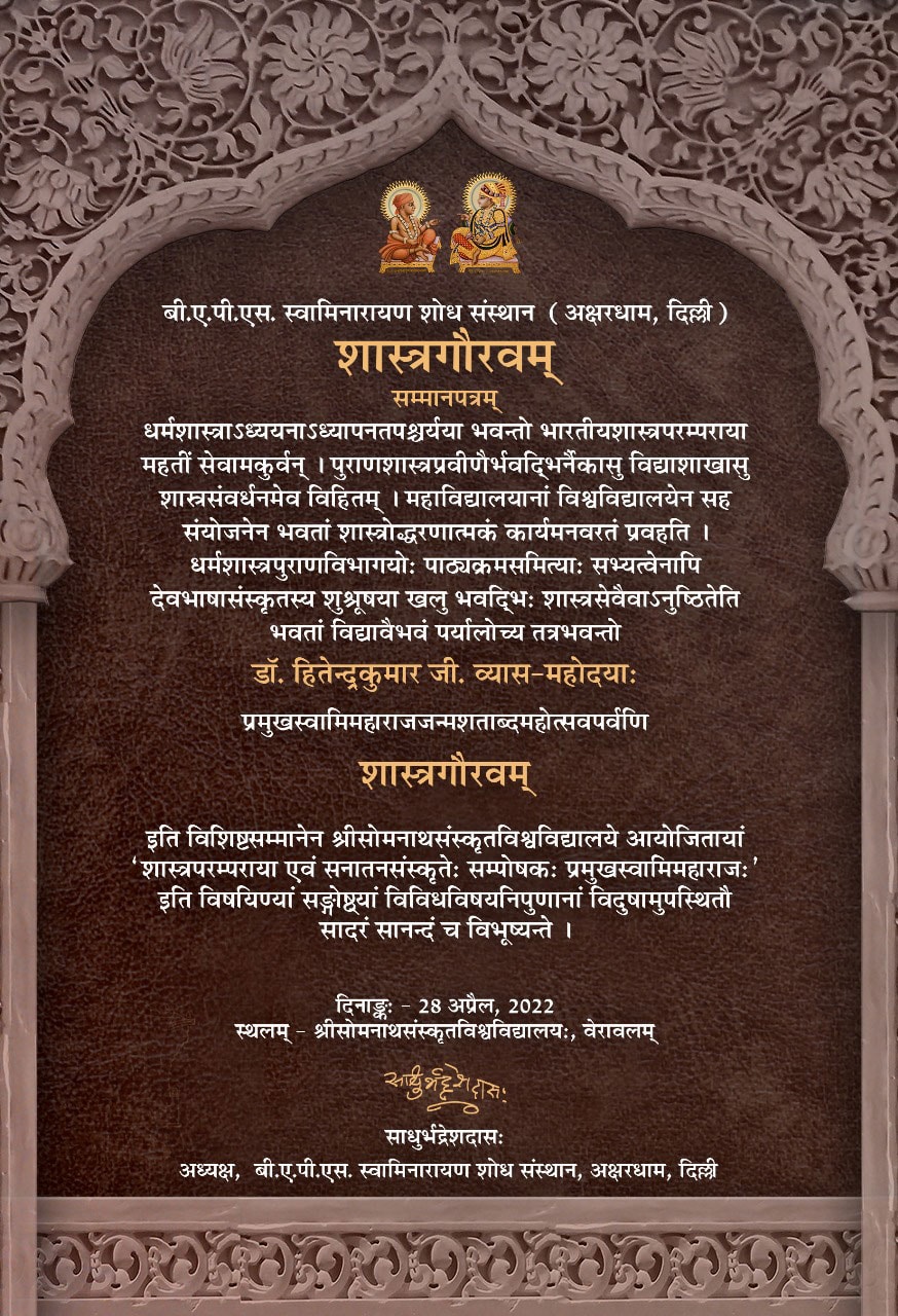 Dr. Hitendrakumar J. Vyas Principal, Shree Vartantu Sanskrit Mahavidyalay, Krishna Dham Sola Bhagwat Vidyapith